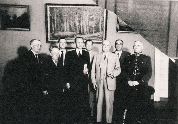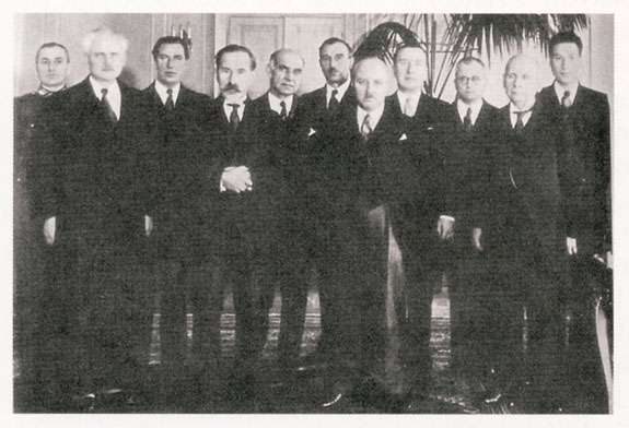 People‘s Government. From the left: M. Mickis, V. Krėvė-Mickevičius, A. Venclova, J. Paleckis, P. Pakarklis, E. Galvanauskas, L. Koganas, V. Vitkauskas. June 17, 1940