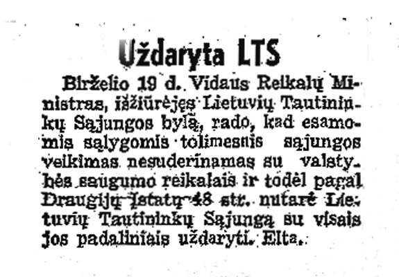Since then the ministry was not any more dependent to People’s Government. It started its repressive activity by closing Lithuanian Nationalists Union and Lithuanian Nationalist Youth Union Young Lithuania (Lietuvių tautiško jaunimo sąjunga „Jaunoji Lietuva“). Its members were removed from their positions and persecuted.