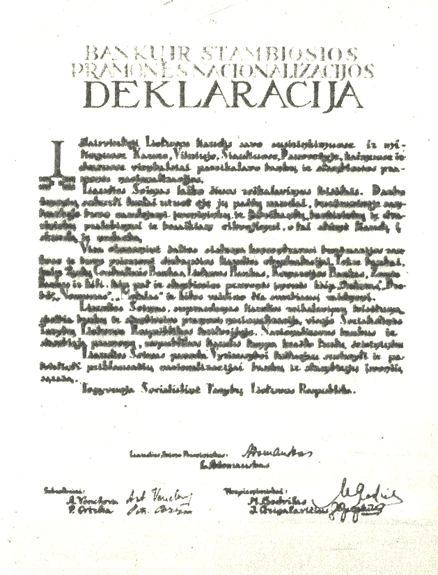 First of all, major banks, credit companies, big industrial firms, publishing houses (“Nemunas”, “Metalas”, “Liviela”, “Petrašiūnai Paper Mill”, “Spindulys” printing-house, “Drobė”, etc) were nationalized. On 31.10.1940 the nationalization of larger private houses, cinemas, hospitals, clinics, drug stores and hotels was started in Kaunas.
