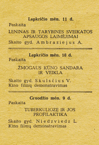 [Liaudies universiteto Sveikatos apsaugos pagrindų fakulteto 1969–1970 mokslo metų programa. – Kaunas, [1969]. – P. 2.]