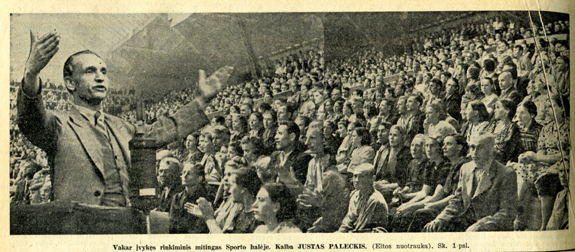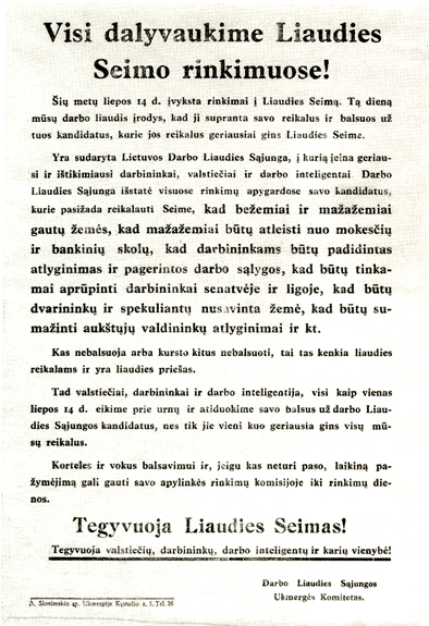 On the 6th of July, election campaign was started with the meeting in the Sports Hall. The date and program of the election were announced; all organizations and free publishing were prohibited. Only Lithuanian Communist Party was allowed to operate. It started an ungovernable propaganda, trying to hide occupation under the name of social revolution. On 10–14.07.1940 arrests started which aimed to neutralize possible resistance to the election campaign; Riflemen’s Union (Šaulių sąjunga) was liquidated.