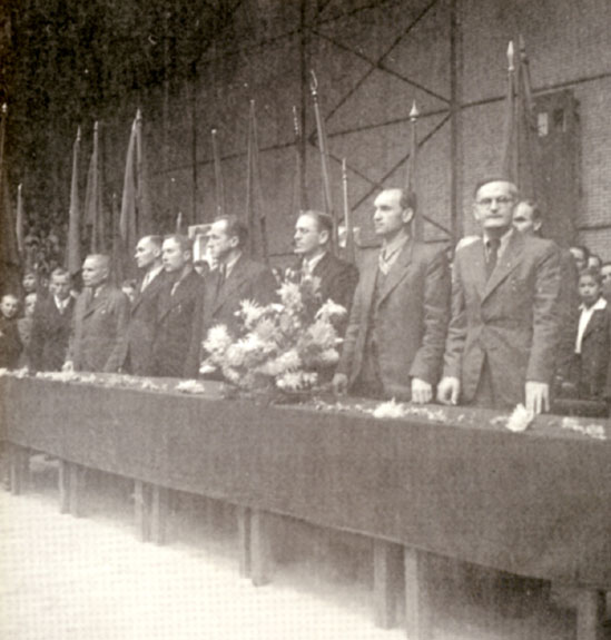 Congress presidium of Lithuanian teachers. Members of the presidium stood up when teachers started  singing Lithuanian national anthem instead of The Internationale. 1940