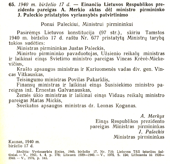 4. Lietuvos Prezidento aktas Nr. 759 dėl naujos Ministrų Tarybos sudėties : 1940 m. birželio 17 d. Lietuvių kalba, Antano Merkio, Justo Paleckio parašai. Mašinraštis, 25×33 cm : [reprodukcija]. – Gretut. tekstas liet., angl. // Lietuva senuosiuose istorijos šaltiniuose. – Vilnius, 2009. – P. 206.