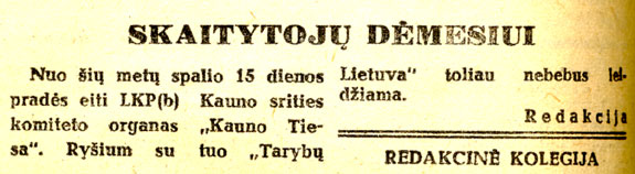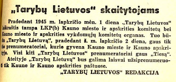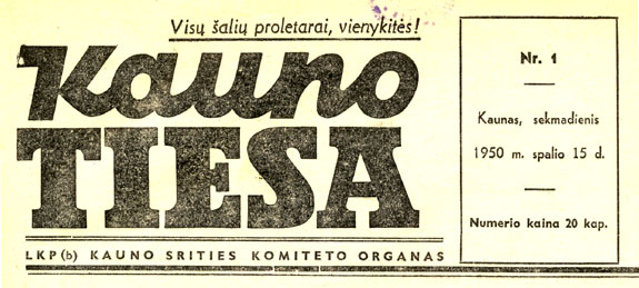 01.11.1945 the first issue of the newspaper “Kaunas Truth” (Lithuanian: „Kauno tiesa”) was published.
