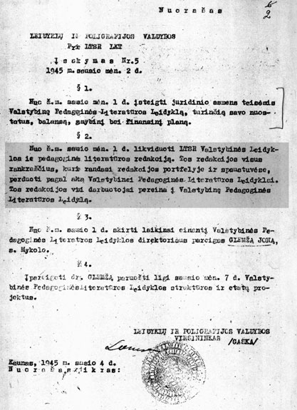 01.01.1945 a State publishing house of educational literature was established (K. Donelaičio St. 2A, since 1947 – K. Donelaičio St. 6) which since 12.02.1964 was known as ‘‘Šviesa’’.